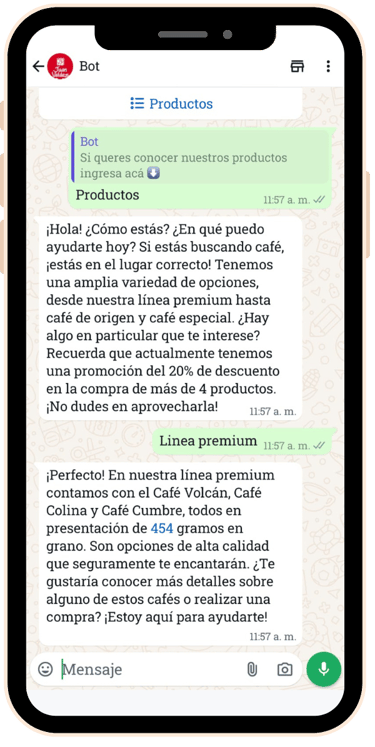 Puedes realizar consultas sobre productos y promociones, tener un carrito de compras y realizar integraciones con diferentes medios de pago, entre otras funciones. Este servicio proporciona una manera conveniente y eficiente para los clientes de realizar compras y obtener información sobre los productos que ofrecemos.